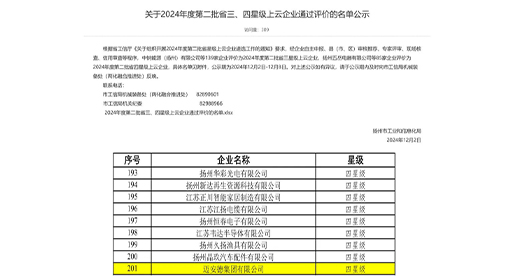 根據省工信廳《關于組織開展2024年度第二批省星級上云企業遴選工作的通知》要求,經企業自主申報、縣(市、區)初審推薦、專家評審、現場核查、信用審查等程序,近日,揚州市工業和信息化局公示了省三、四星級上云企業通過評價的名單,邁安德集團榜上有名。這是繼今年8月獲批為省級三星級上云企業后,同年再次獲得省級四星級上云企業。