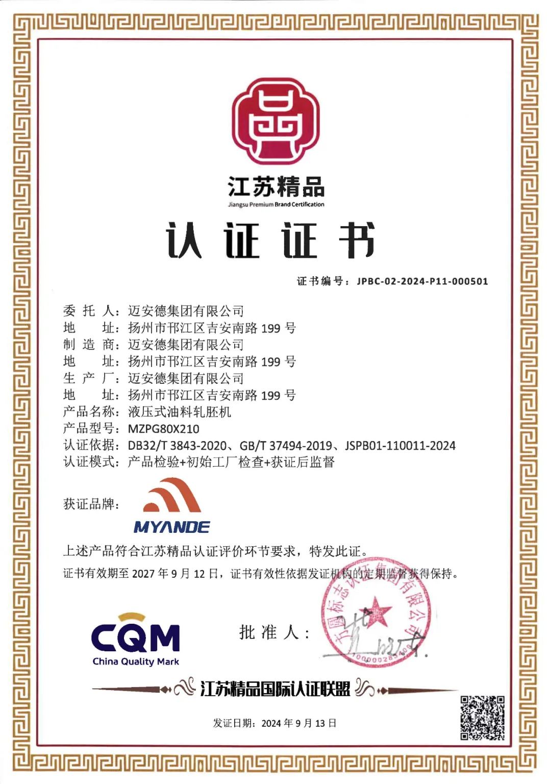 近日,江蘇省質量發展委員會辦公室聯合江蘇省市場監管局等九部門發布2024年“江蘇精品”認證獲證企業名單,邁安德核心產品“油料軋胚機”成功上榜。