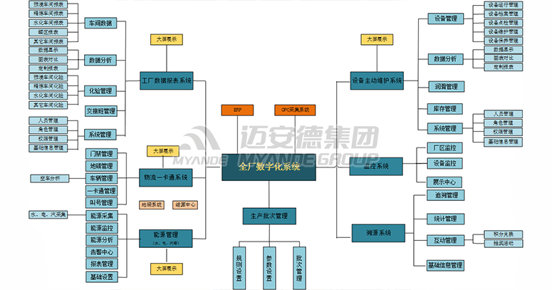 邁安德基于最新的工業4.0理念,通過工廠內部網絡,對各車間生產數據通過PLC進行采集,與實際業務數據(采購、原料、批次、運輸、生產、化驗、倉儲、銷售、財務等)充分結合,運用數據整合、報表分析使客戶實現全廠生產運營過程的自動化、透明化、可視化、精益化、數據化,打造全新的智能化工廠。